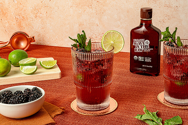 - Juice 2 lime quarters into a rocks glass or tumbler. Add remaining lime quarters, mint, berries, agave, and rum and muddle until fruit is crushed. Add 1 cup ice and soda water to fill. Stir.